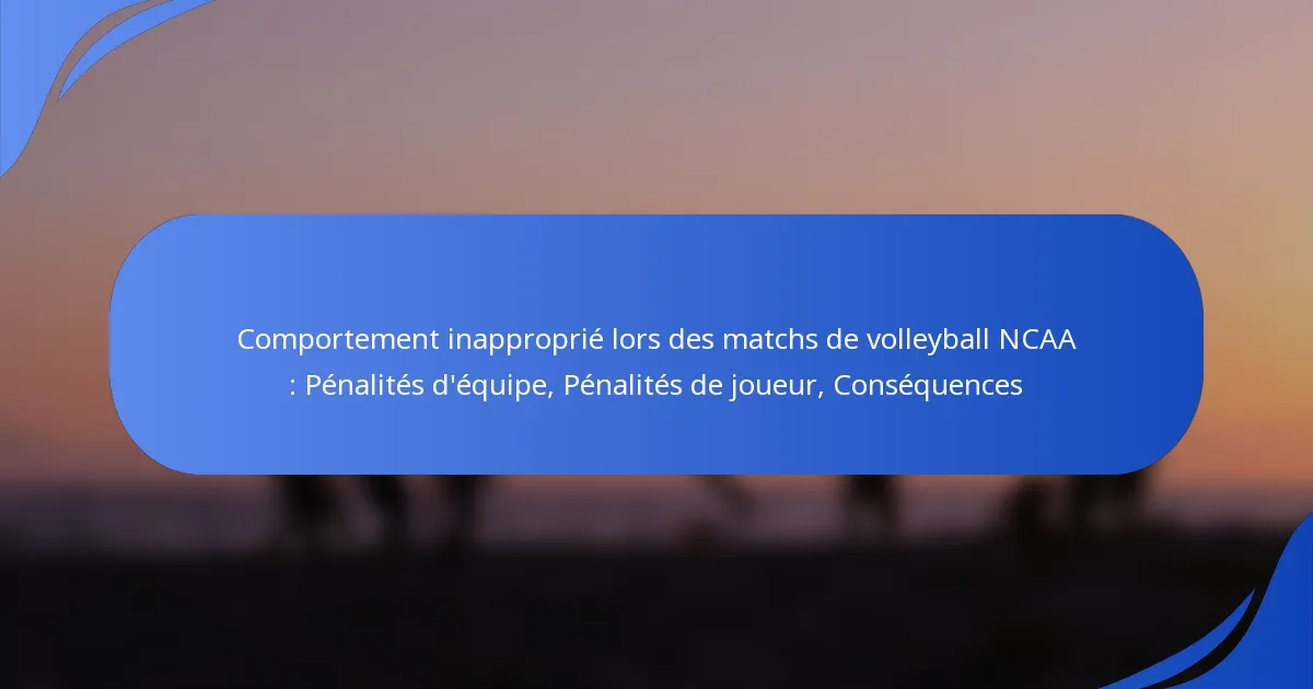 Le volleyball NCAA impose diverses pénalités pour la mauvaise conduite des équipes, qui peuvent affecter de manière significative la performance et le classement d’une équipe. Ces pénalités peuvent inclure des déductions de points et des forfaits de match, impactant à la fois le match immédiat et les résultats globaux de la saison.